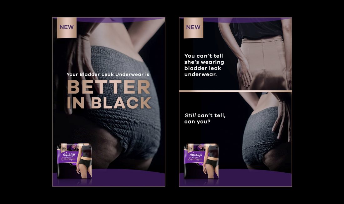 Create Facebook assets to help launch Black Low-Rise and change the picture she has in her head of bladder leak underwear.